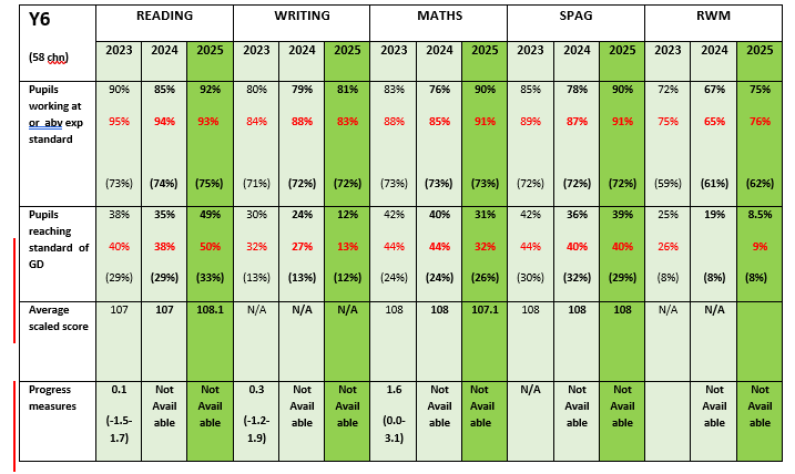 Average progress scores show how much progress pupils at this school made between the end of KS1 and the end of KS2 compared to pupils across England who got similar results at the end of key stage 1. Figures in brackets show the lowest figure for national expectations. Expected progress would be 0. (Not 2020 or 2021) We have done well in all three areas but clearly writing needs to be on par with the other two subjects.